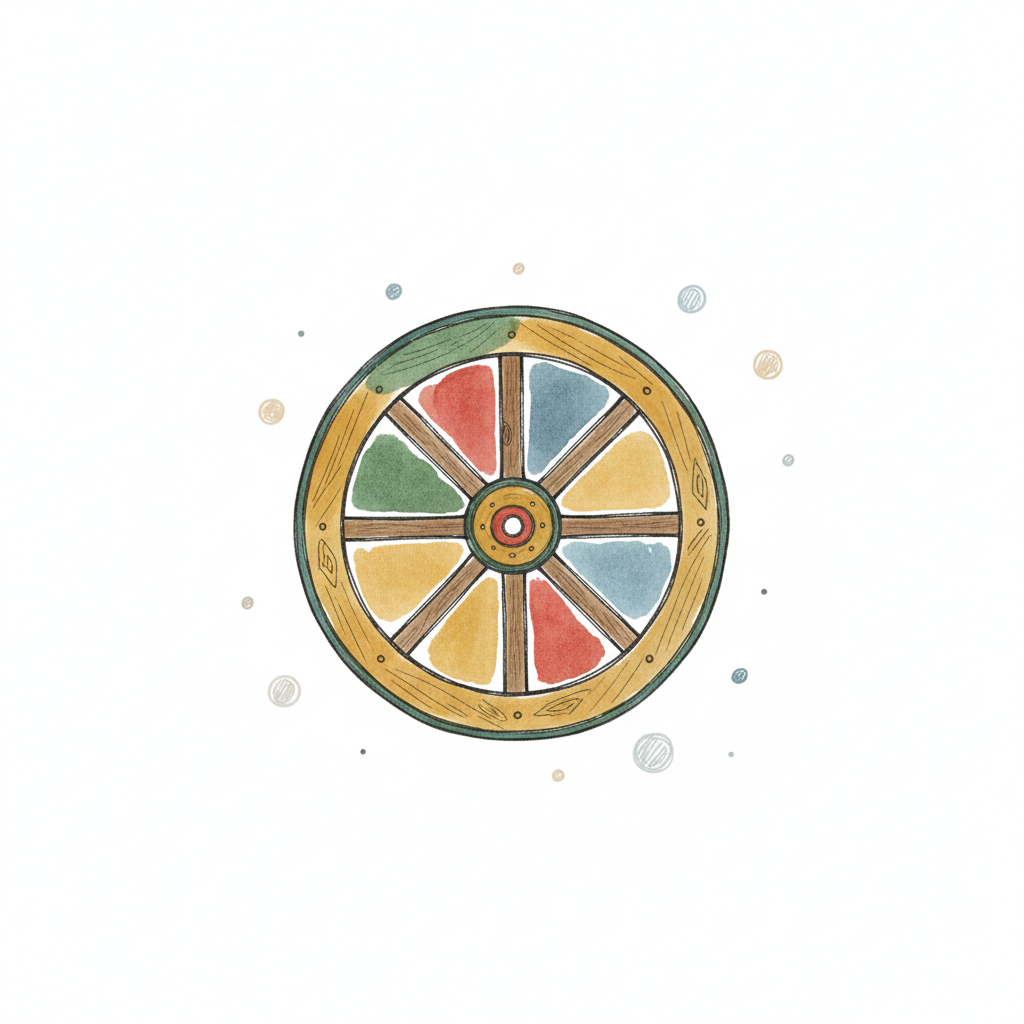 Buntes Holzrad im Aquarellstil mit verschiedenen Farbfeldern und Sprenkeln auf weißem Grund.