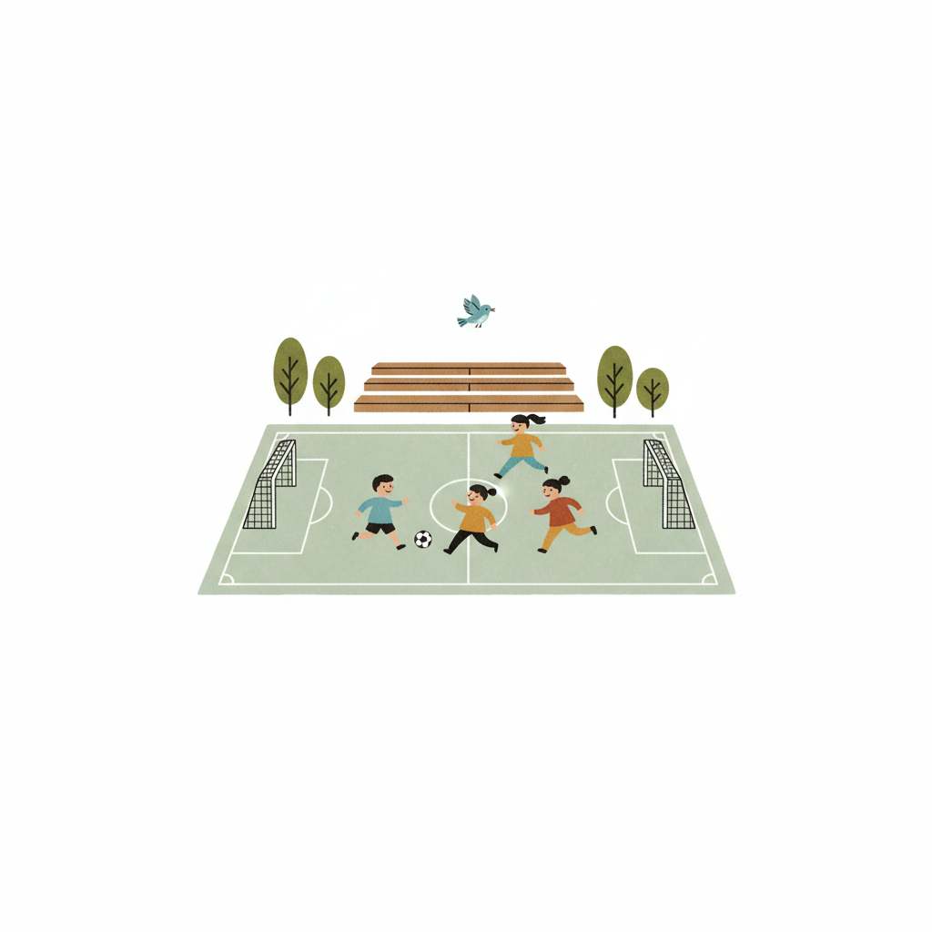 Fünf Kinder spielen Fußball auf einem Feld mit Bäumen, Tribüne und einem Vogel.