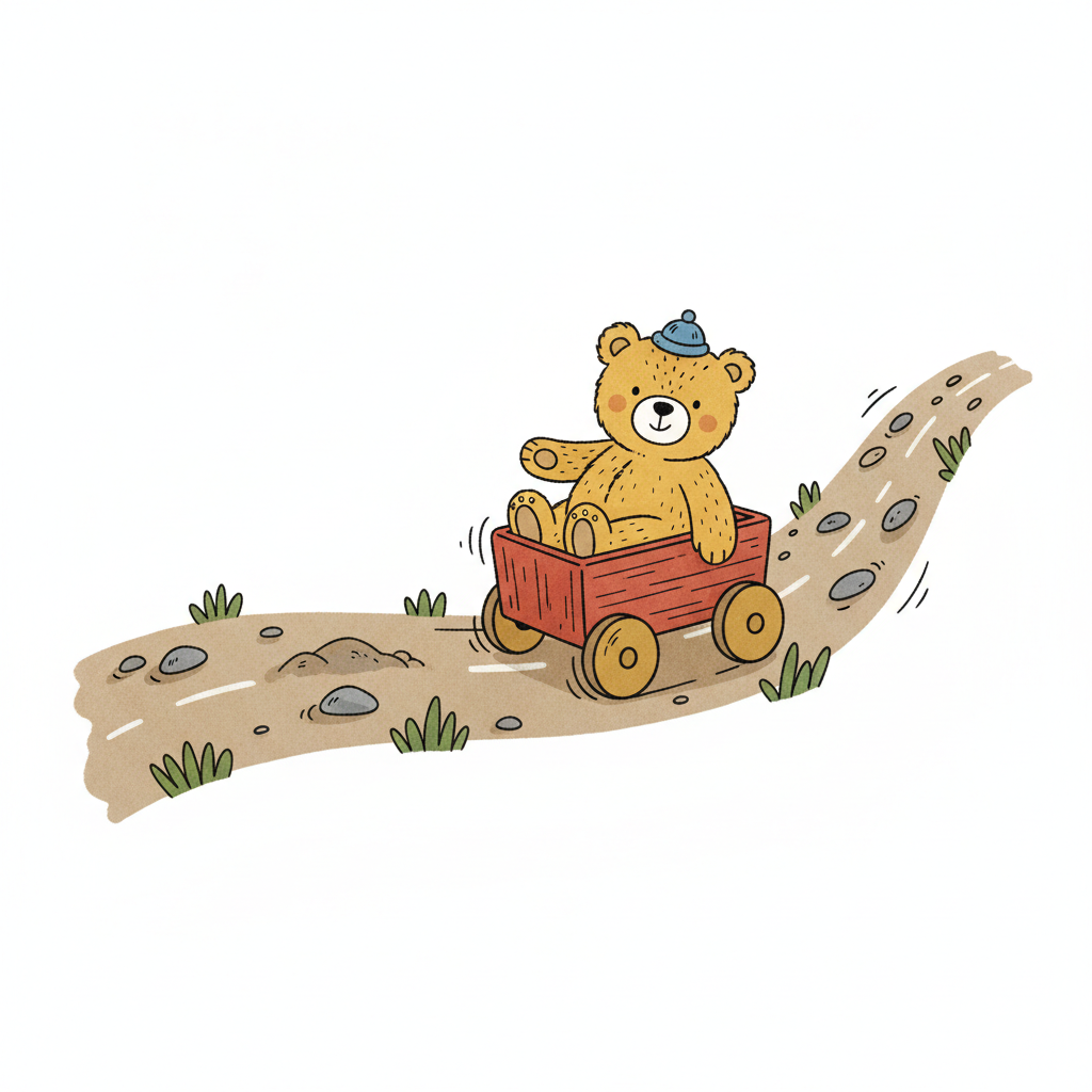 Niedlicher Cartoon-Bär mit Hut fährt in einem roten Wagen auf einem kurvigen Feldweg.