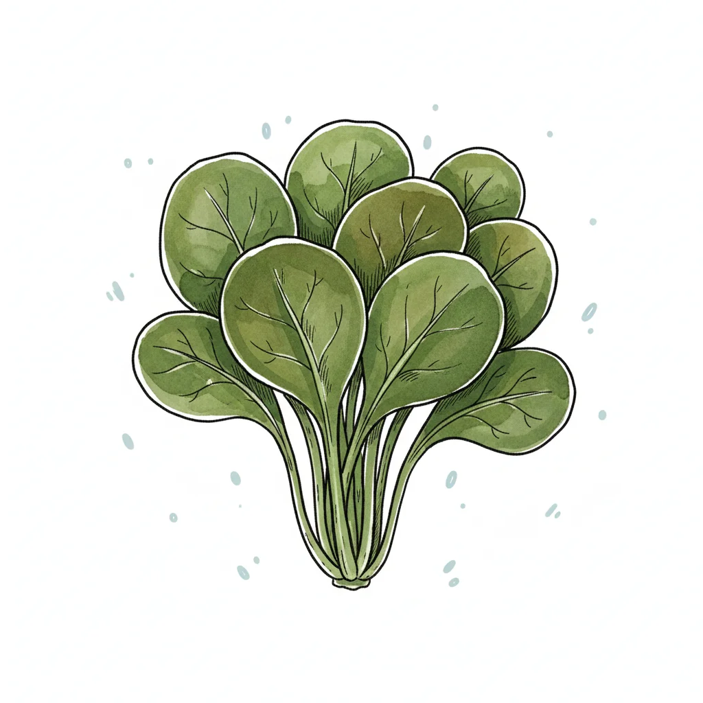Aquarell-Illustration von frischem, grünem Spinat mit leichten Spritzern auf weißem Grund.