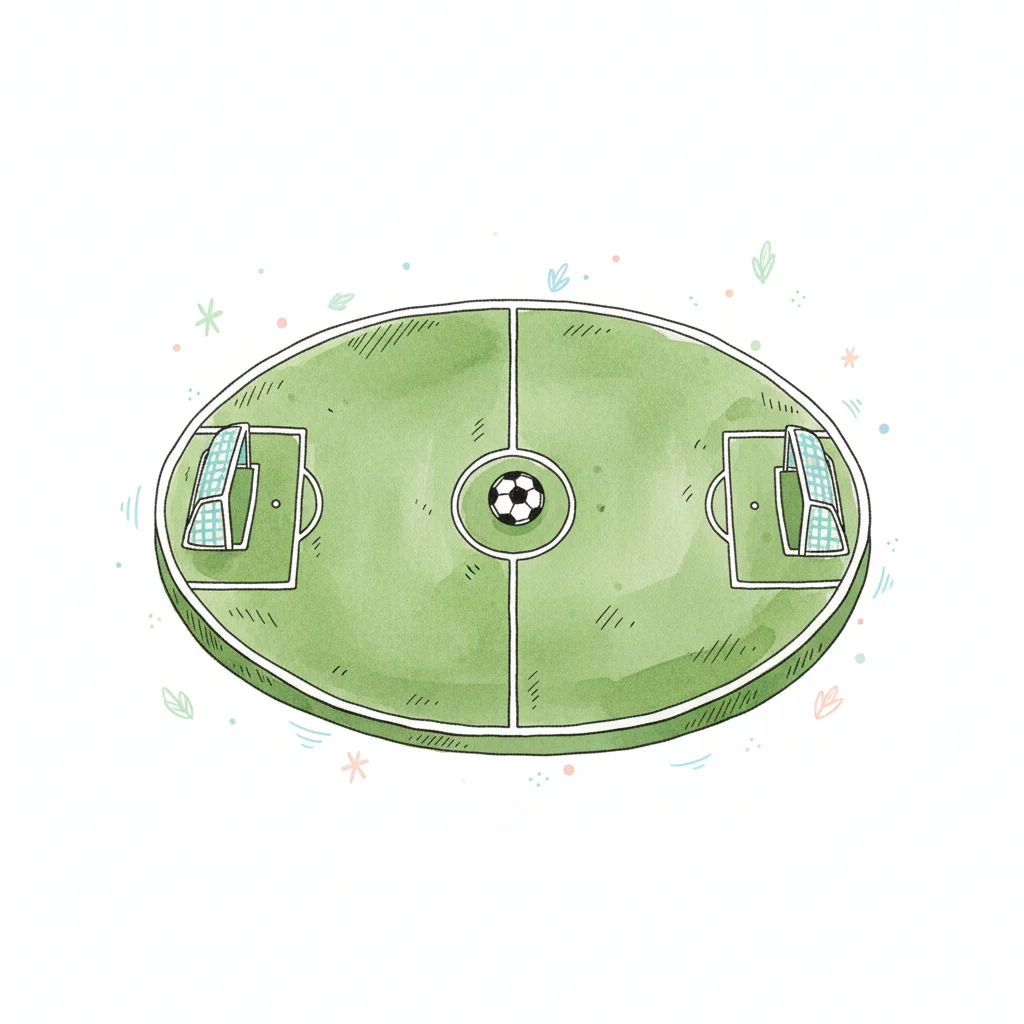Niedliche Aquarellzeichnung eines Fußballfeldes von oben mit Ball und Toren.
