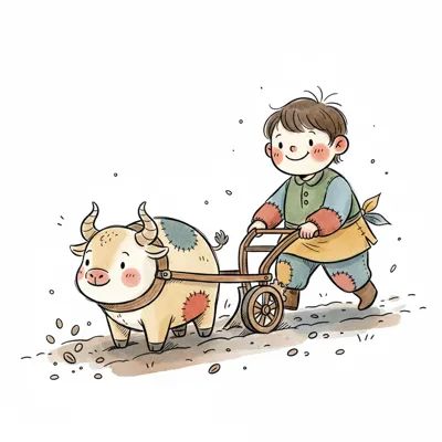 Ein Junge pflügt mit einer Kuh ein Feld. Die Kuh trägt Blumen auf dem Kopf. Aquarell-Illustration.
