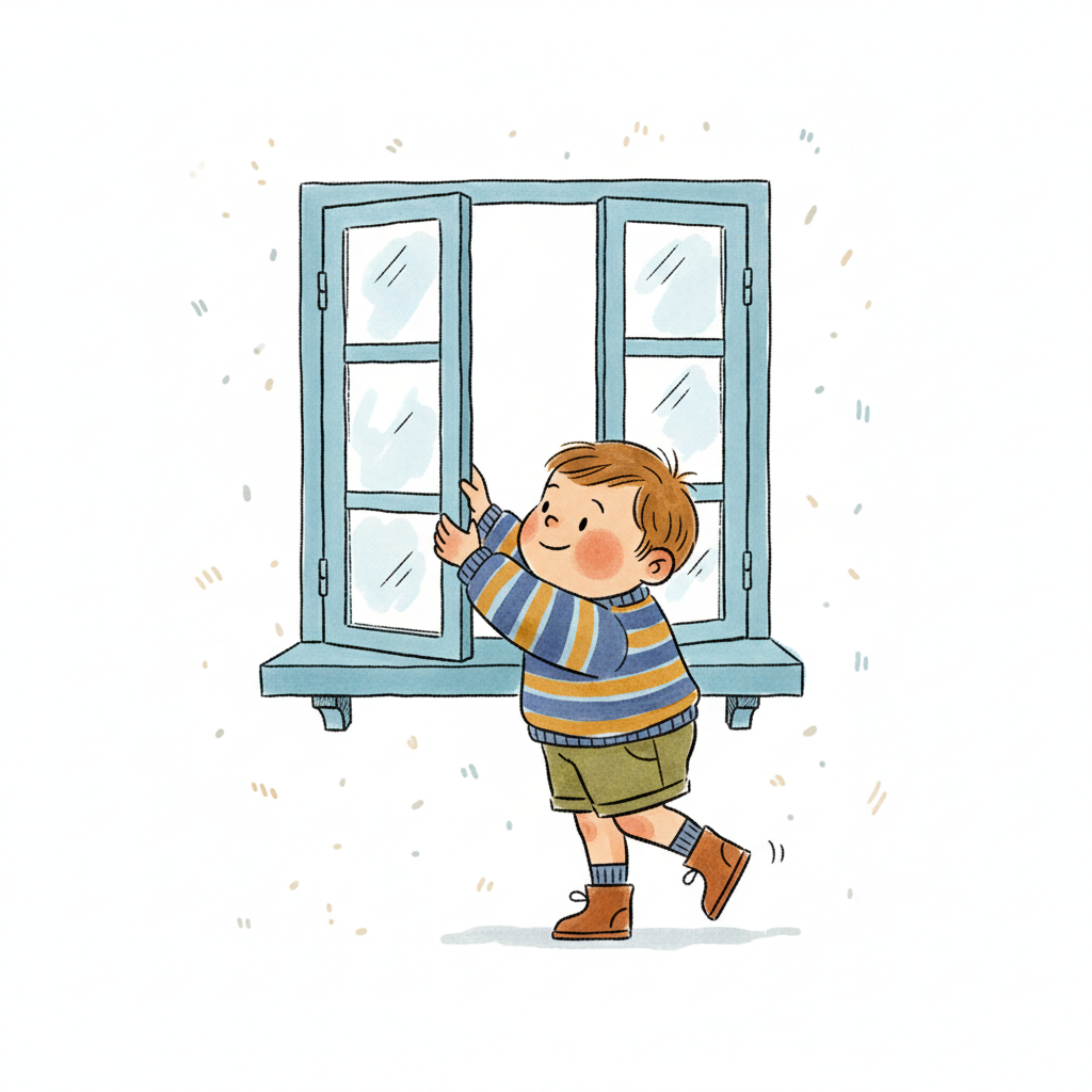 Ein Junge öffnet ein Fenster und schaut neugierig hinaus.