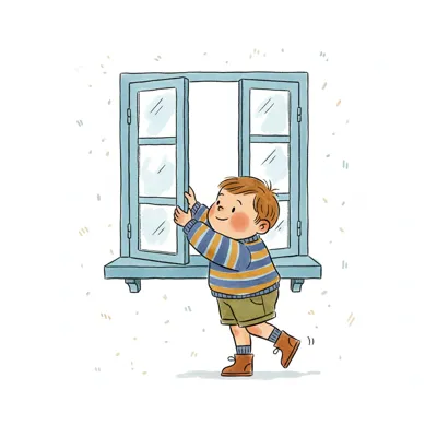 Ein Junge öffnet ein Fenster und schaut freudig nach draußen.