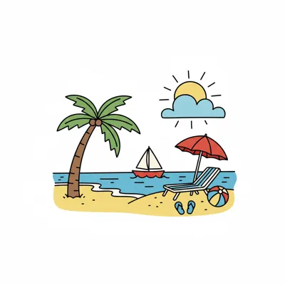 Ein sonniger Strand mit Palmen, Liegestuhl und Segelboot.