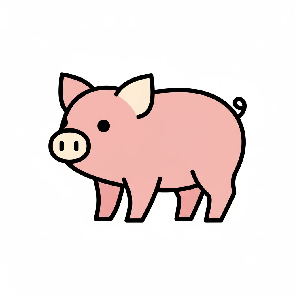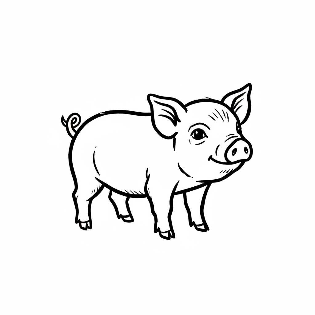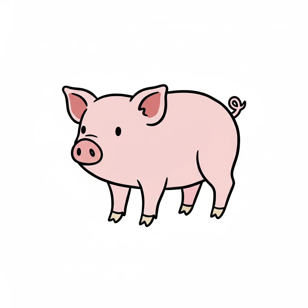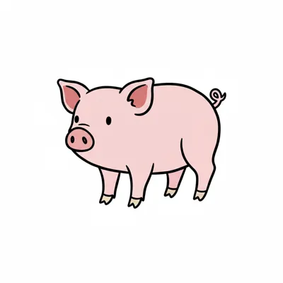 Ein niedliches, cartoonhaftes Schwein, rosa mit schwarzen Konturen.