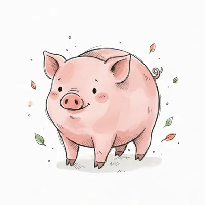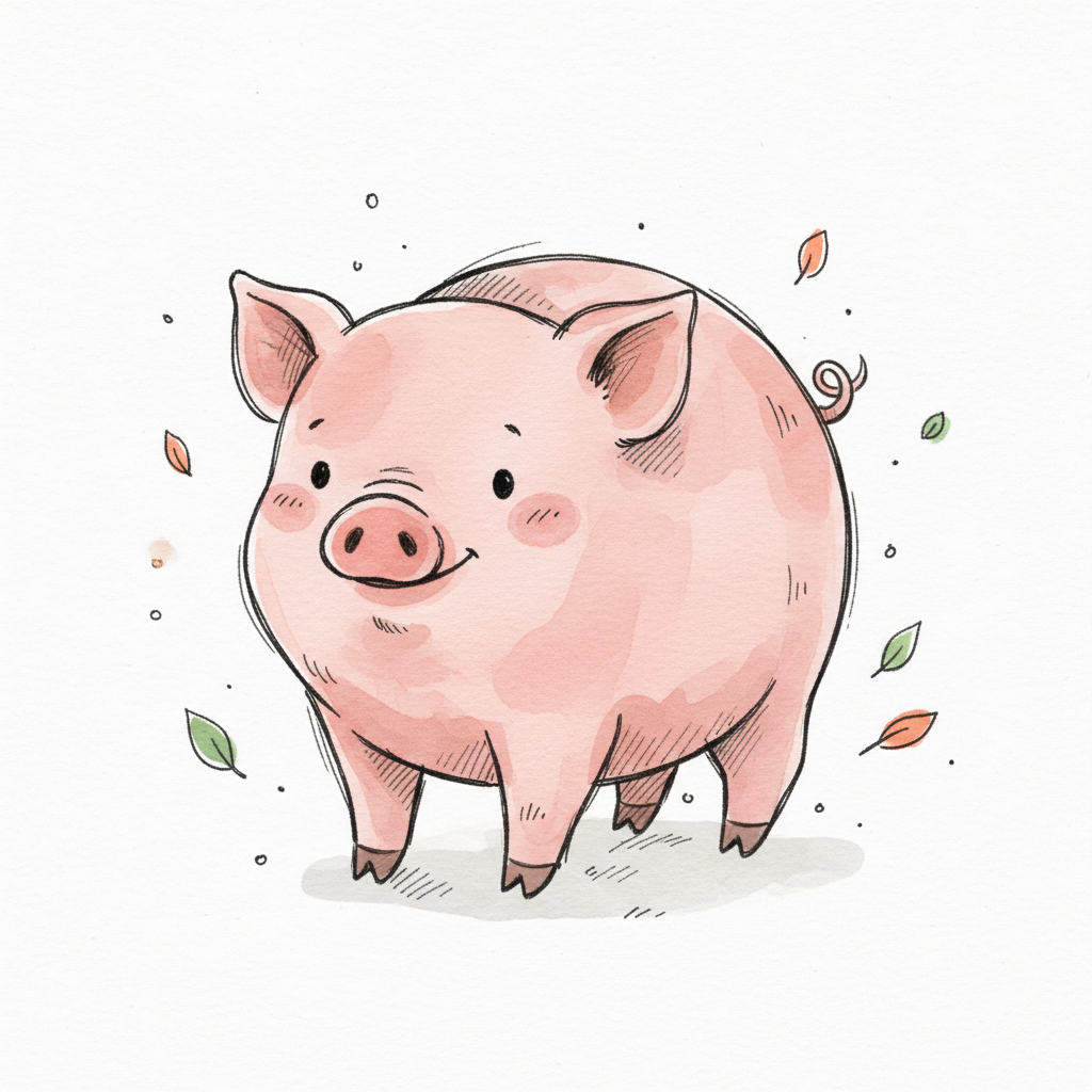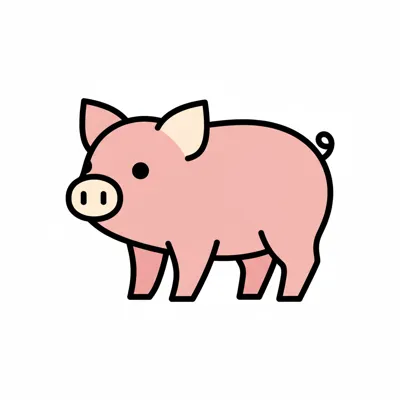 Ein niedliches, cartoonhaftes Schwein mit runden Formen und einem fröhlichen Gesicht.