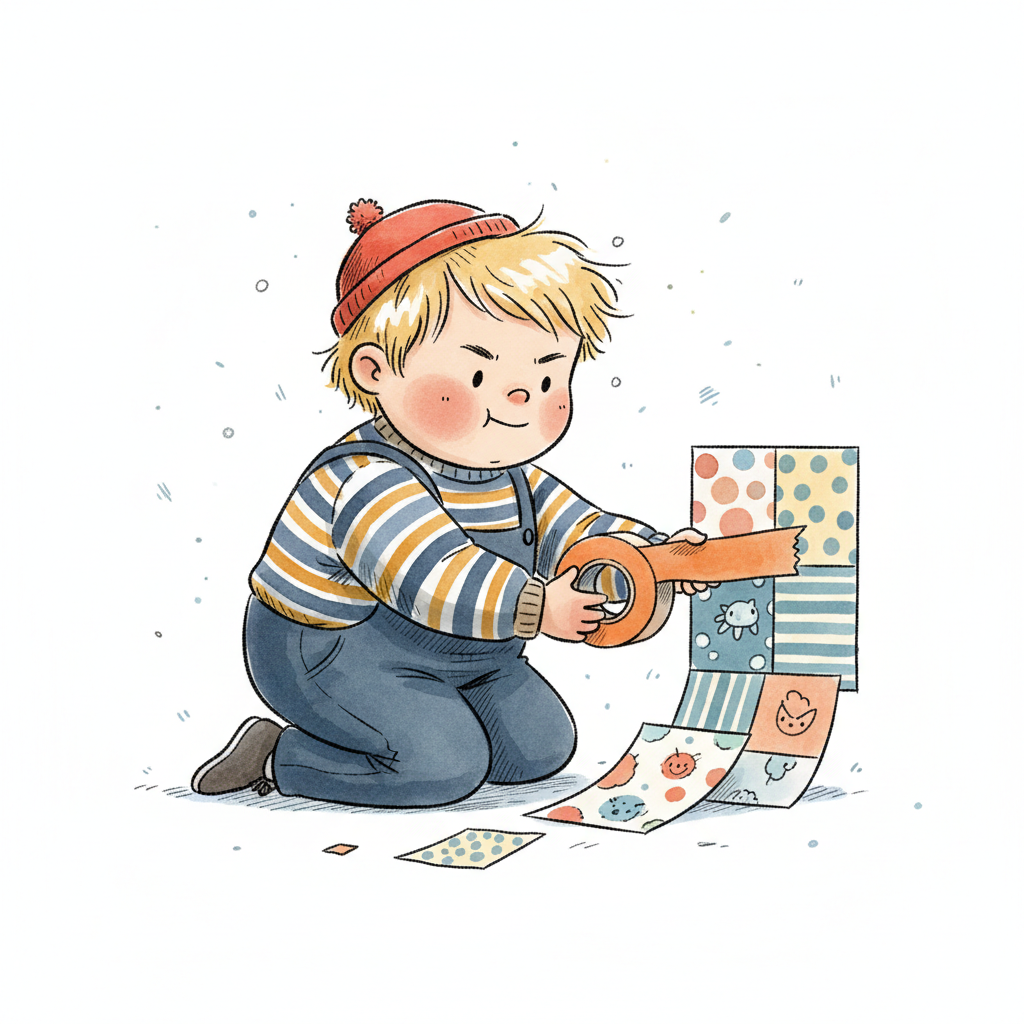 Ein niedliches Kind klebt bunte Papiere mit Klebeband zusammen.