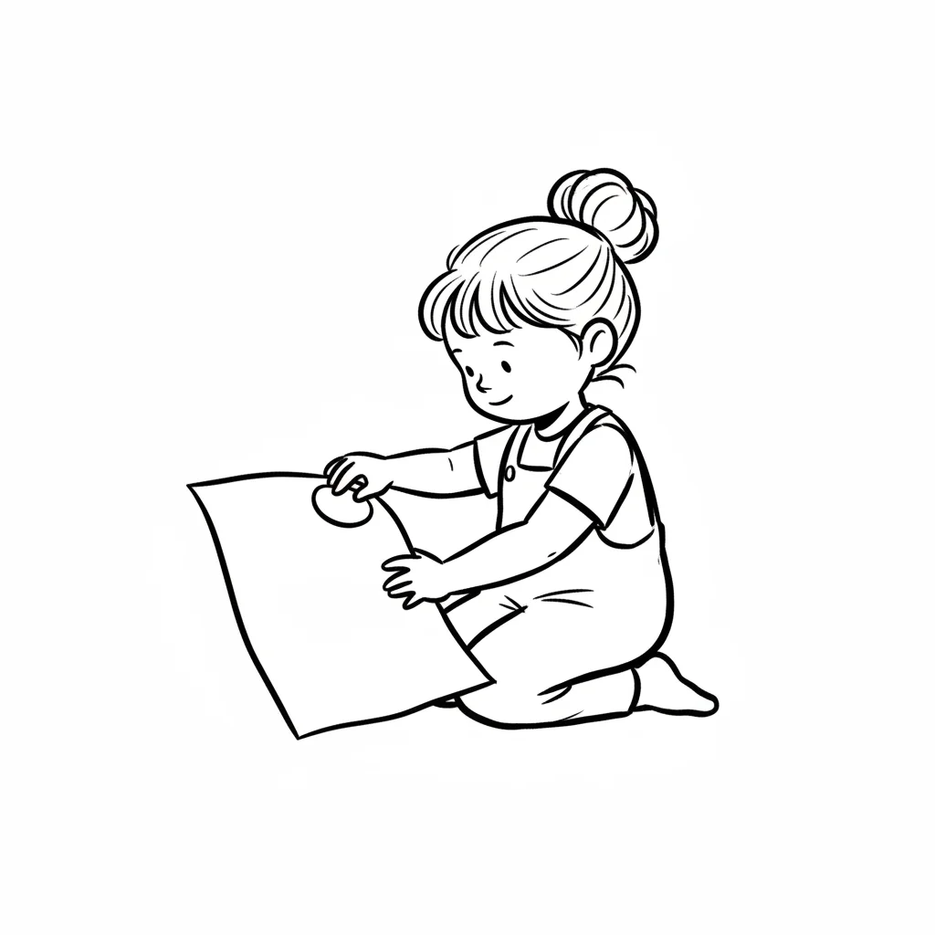Cartoon-Mädchen sitzt auf dem Boden und stanzt ein Loch in ein Blatt Papier.