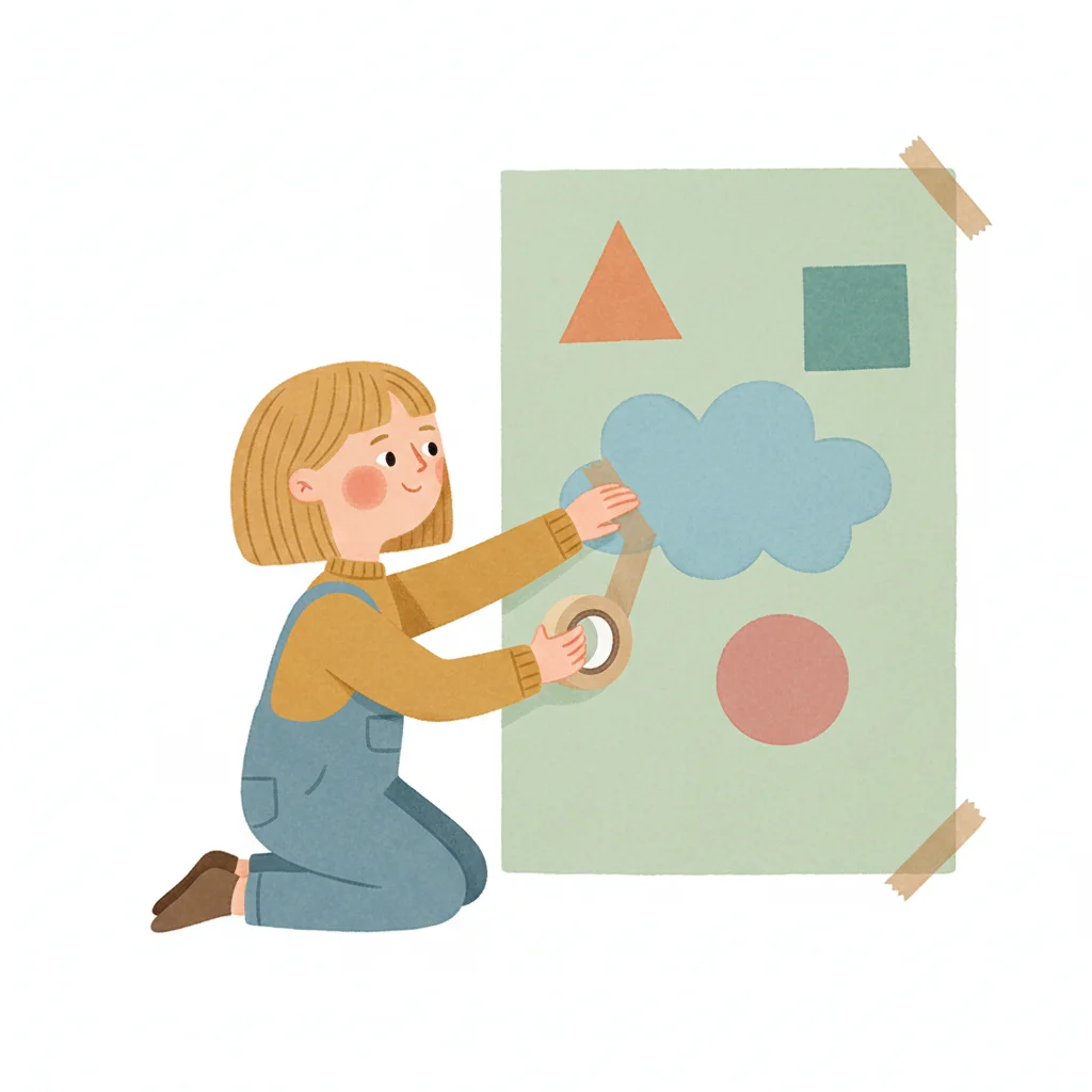 Ein Mädchen klebt Formen (Wolke, Dreieck, Quadrat, Kreis) auf ein Plakat mit Klebeband.
