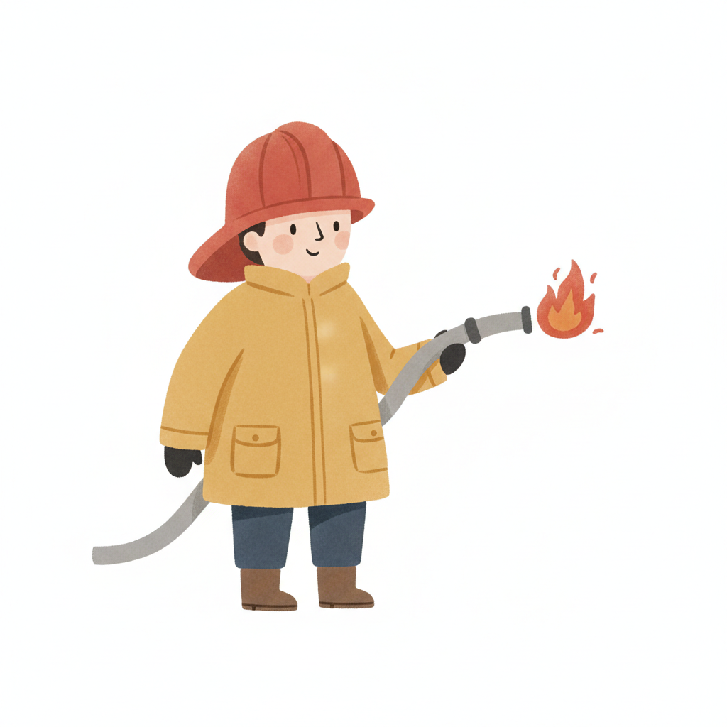 Ein fröhlicher Feuerwehrmann mit Schlauch und Flamme.