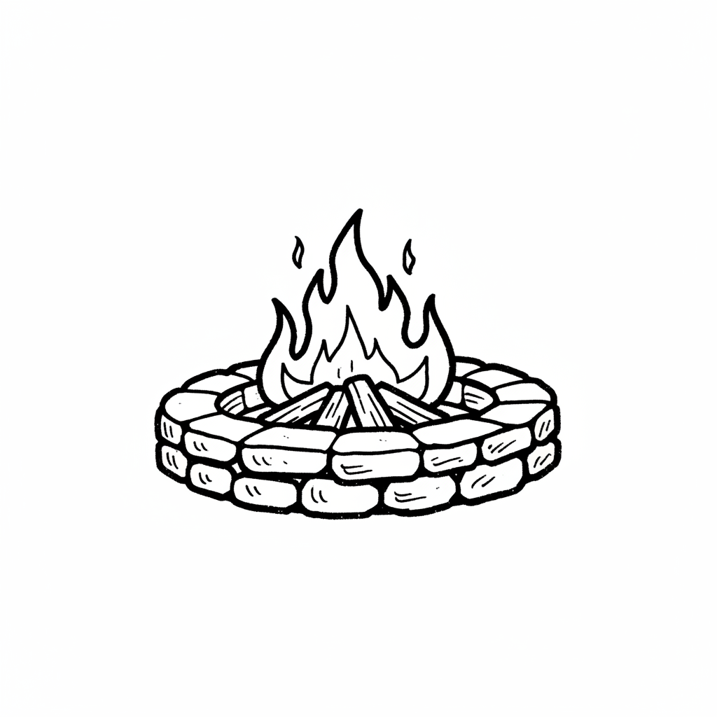Handgezeichnetes Lagerfeuer mit Steinkreis und leuchtenden Flammen, umgeben von dekorativen Elementen.