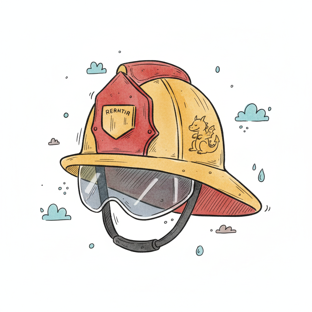 Illustrierter gelber Feuerwehrhelm mit rotem Schild, Visier und einem niedlichen Drachen.
