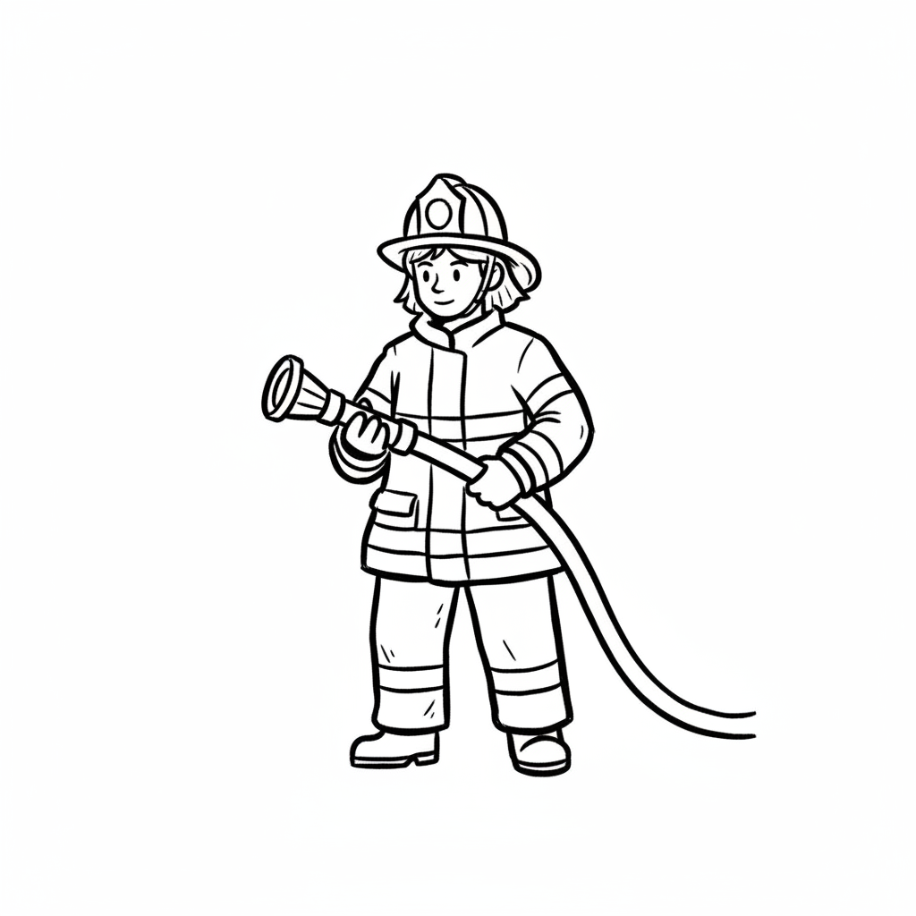 Strichzeichnung eines Feuerwehrmanns in Uniform, der einen Feuerwehrschlauch hält.