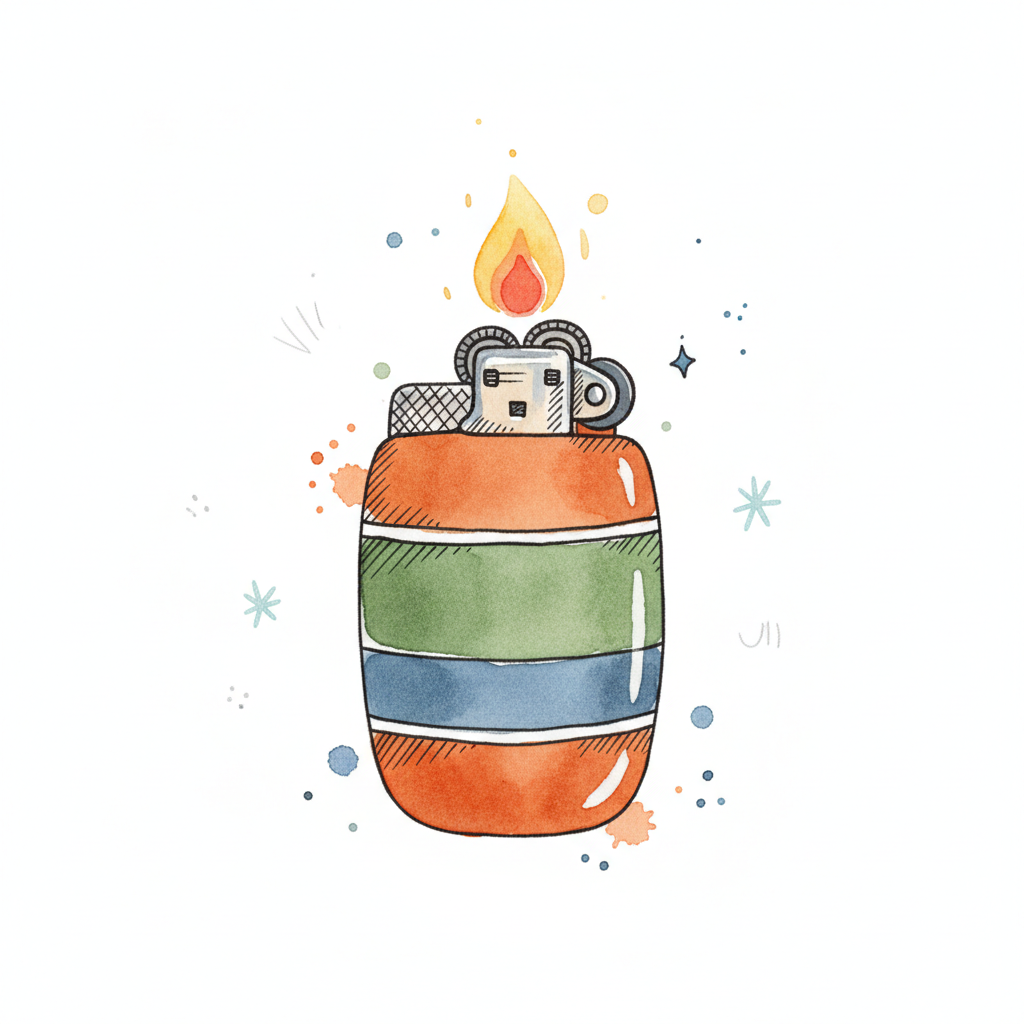 Buntes Aquarell-Feuerzeug mit Flamme und kleinen Spritzern auf weißem Hintergrund.