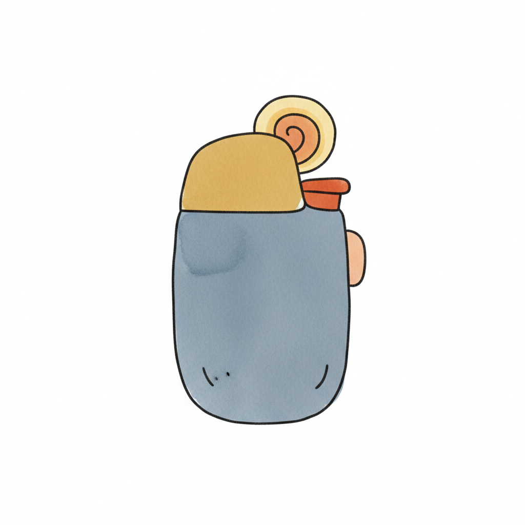 Für ältere Kinder illustrierter Gegenstand als einzelner, zentrierter Gegenstand vor weißem Hintergrund, im frech-nordischen Aquarell-Skizzenstil. Klare, leicht wackelige Tuschekonturen, sichtbare Pinsel- und Strichtextur, dezente Schraffuren, weiche handgemalte Farbflächen in gedeckten Farben. Runde, einfache Formen. Keine harten Schatten, sondern sanfte, transparente Aquarellschichten. Leicht raue, handgezeichnete Linien statt glatter Vektorkanten. Subtile, vereinzelte Kritzelpunkte oder kleine Details im Hintergrund, aber keine echte Szene. Gegenstand steht oder schwebt mittig. Insgesamt charmant, humorvoll, warm und handgemacht wirkend, wie eine moderne Illustration auf weißem Hintergrund. Gegenstände sollen keine Gesichter haben.