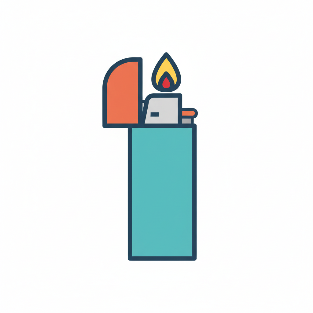 Ein gezeichnetes rotes Feuerzeug mit blauem Boden und brennender Flamme auf weißem Hintergrund.