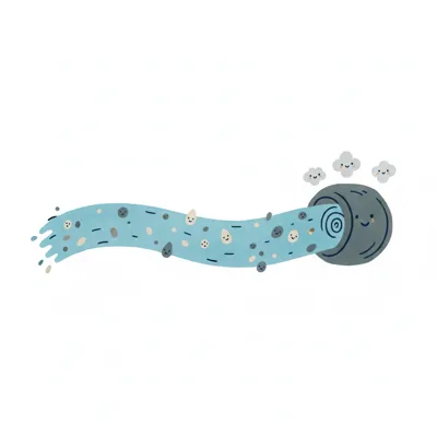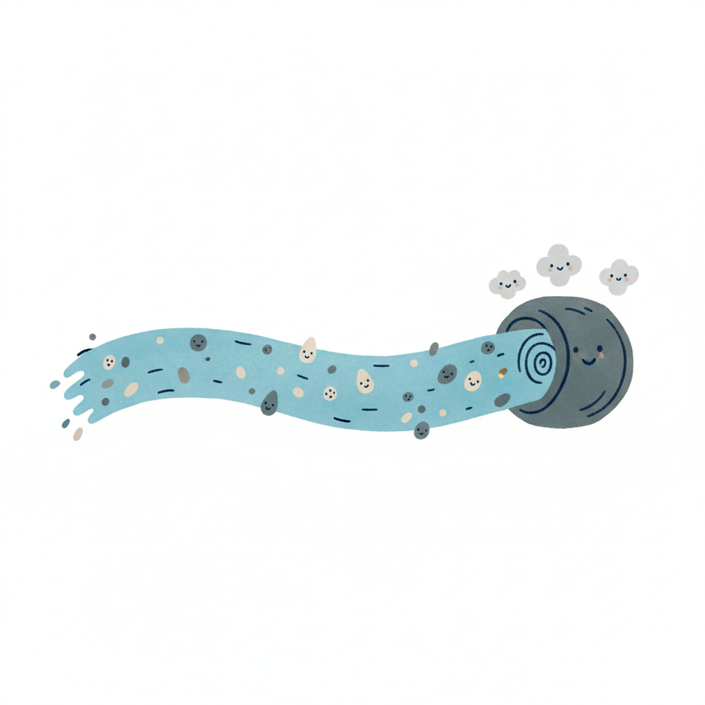 Niedliche Illustration: Partikel fließen in einen Filter, der saubere, lächelnde Wolken abgibt.