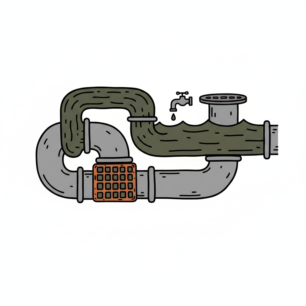 Ein Rohrsystem mit schmutzigem Wasser aus einem Hahn und einem Filter, der zu sauberen Rohren führt.