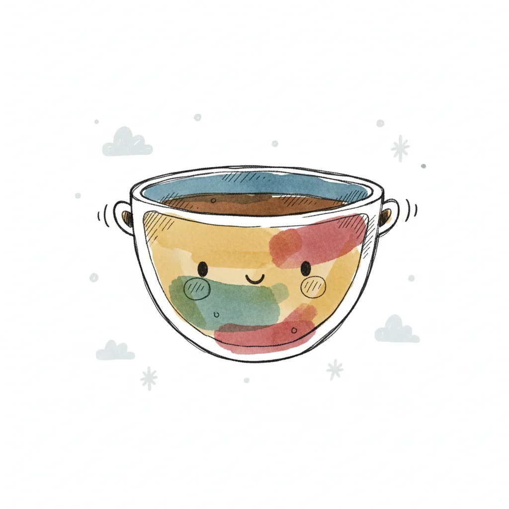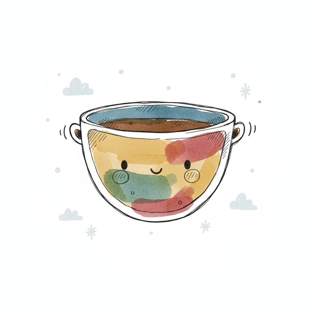 Niedliche, lächelnde Tasse mit bunten Aquarellflecken und heißem Getränk, umgeben von kleinen Wolken.