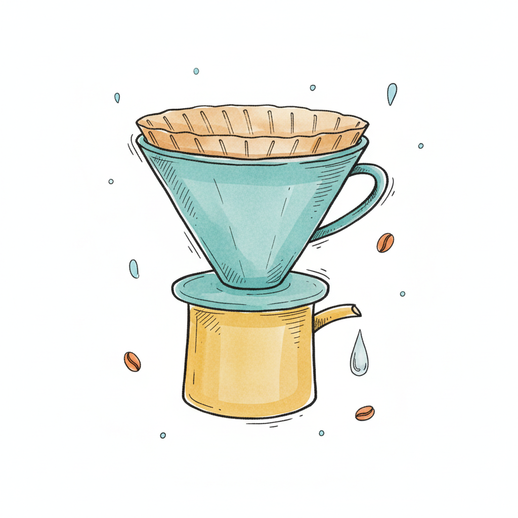Handgezeichnete Illustration eines Pour-over Kaffeebereiters mit Filter, Kaffeebohnen und Wassertropfen.