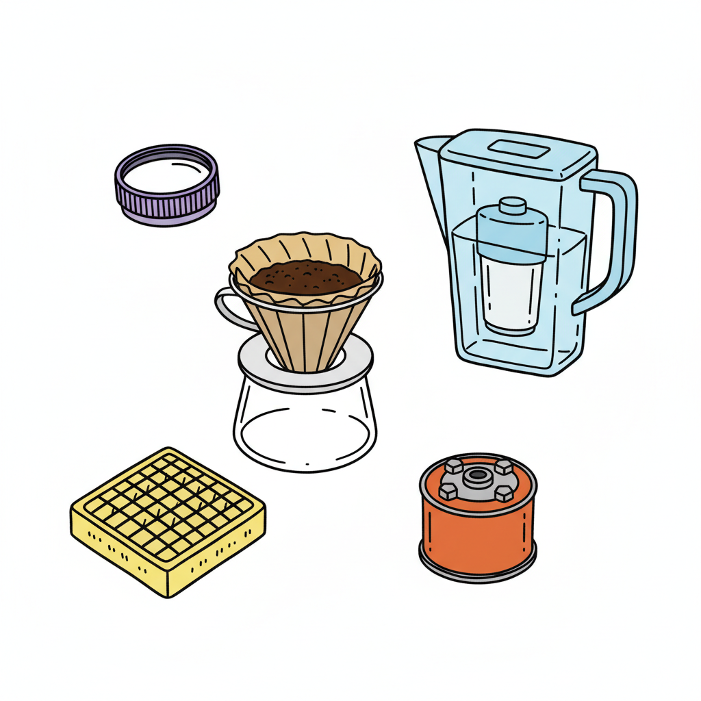 Illustration von Kaffeezubereitungsutensilien (Filterkaffee) und einem Wasserfilterkrug.