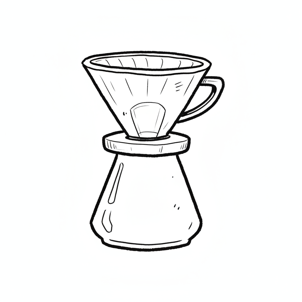 Einfache Skizze eines Kaffeefilters (V60-Stil) auf einer Kaffeekanne für Pour-over-Kaffee.