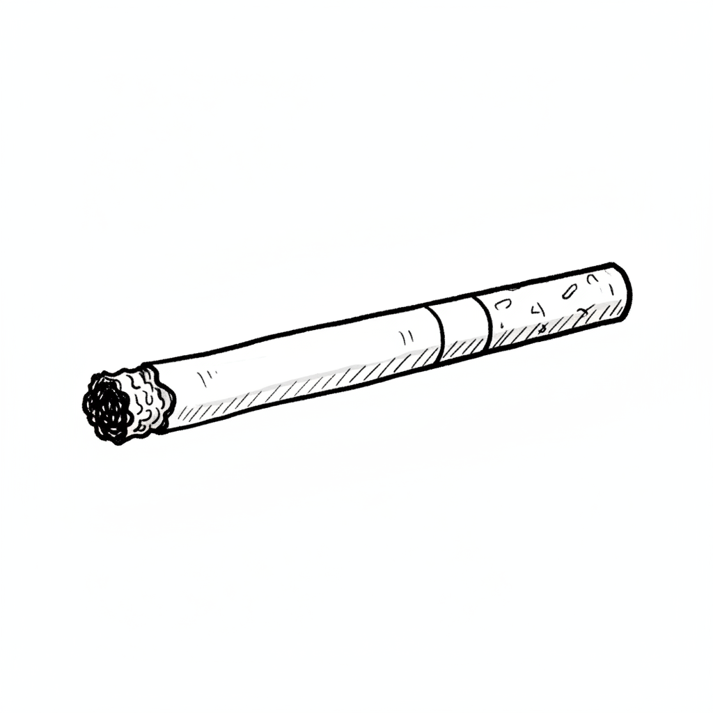 Skizze einer Zigarette mit Filter und brennendem Ende auf weißem Hintergrund.