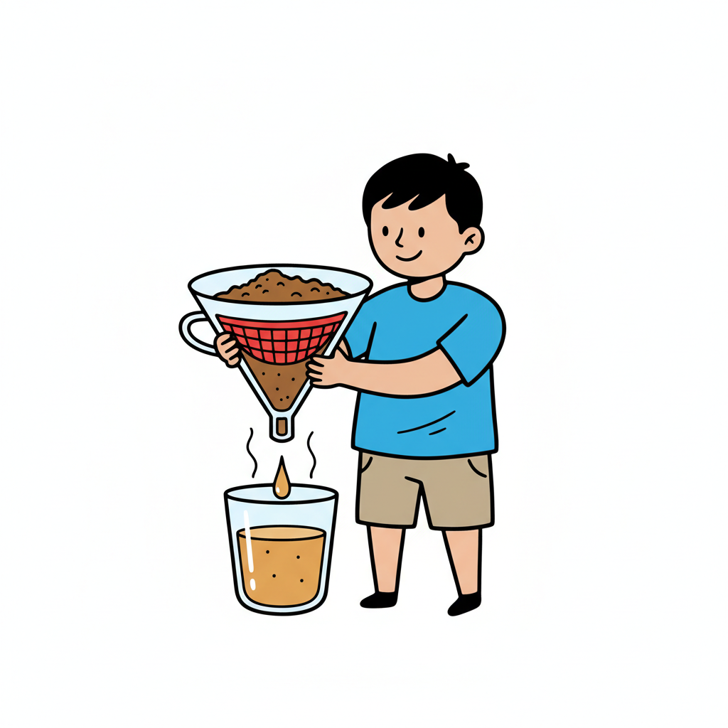 Ein Junge filtert Flüssigkeit mit Trichter und Tuch in eine große Flasche.