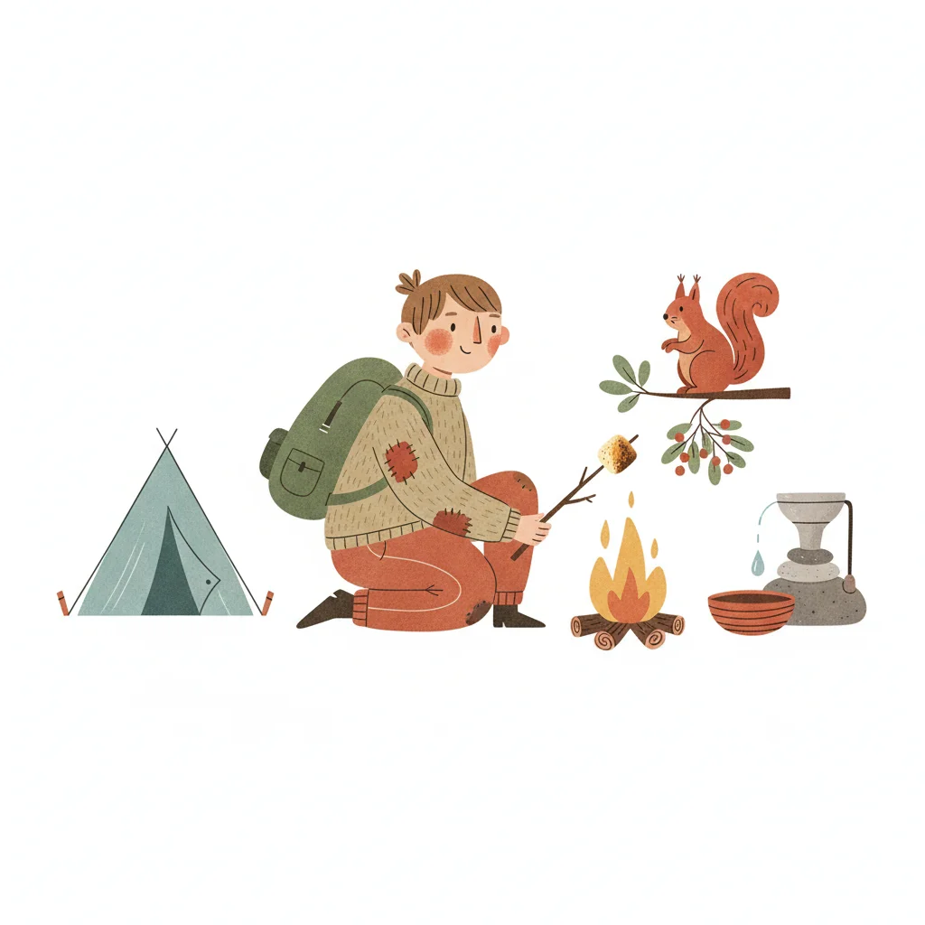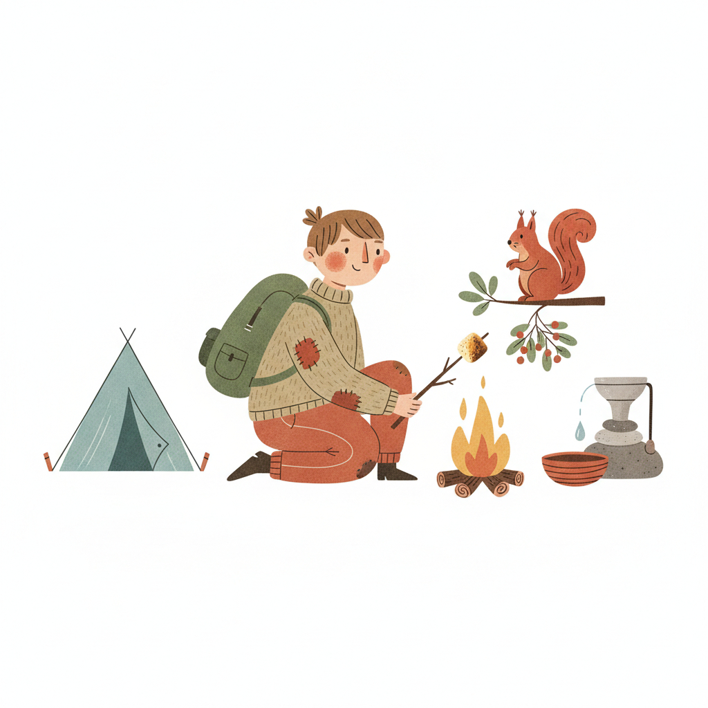 Ein Camper röstet etwas am Lagerfeuer, daneben Zelt, Eichhörnchen und Wasserfilter.