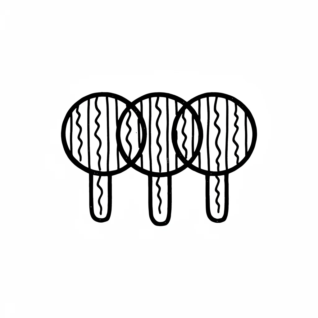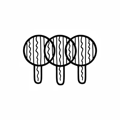 Drei stilisierte, handgezeichnete Doodle-Objekte mit runden Köpfen und Stielen in Schwarz-Weiß.