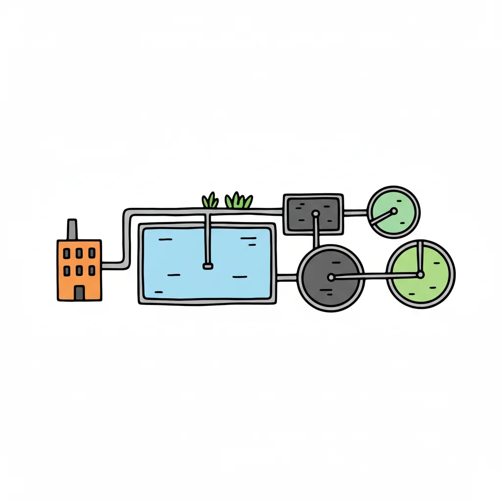 Schema einer Wasseraufbereitungsanlage mit Gebäude, Becken und Filterstufen im Doodle-Stil.