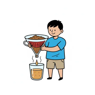 Ein Junge brüht Kaffee mit einem Filter, während heißer Kaffee in ein Glas tropft.