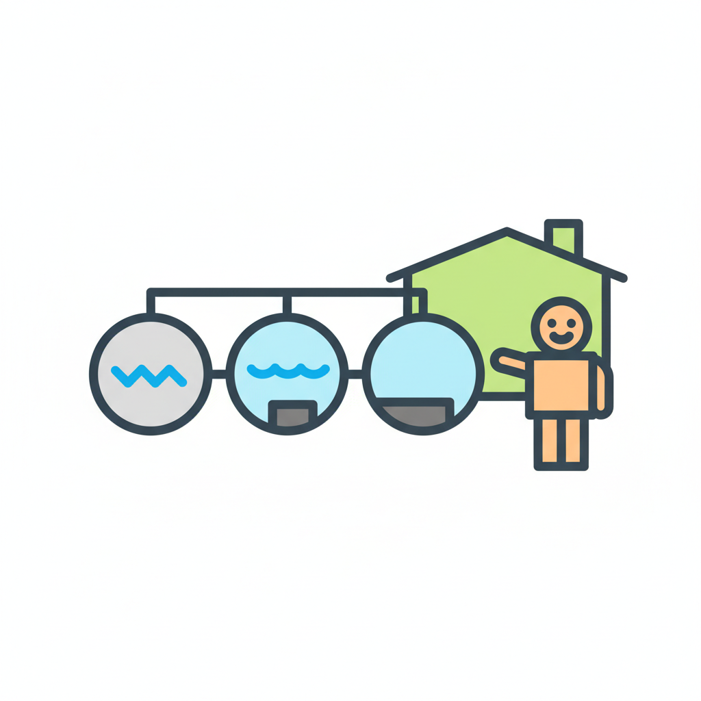 Illustration eines häuslichen Wasseraufbereitungssystems mit drei Stufen und einer Person.