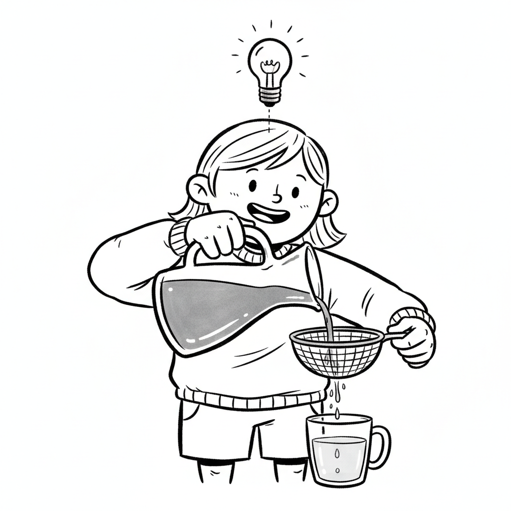 Mädchen gießt Flüssigkeit durch ein Sieb in eine Tasse, mit einer Glühbirne über dem Kopf.