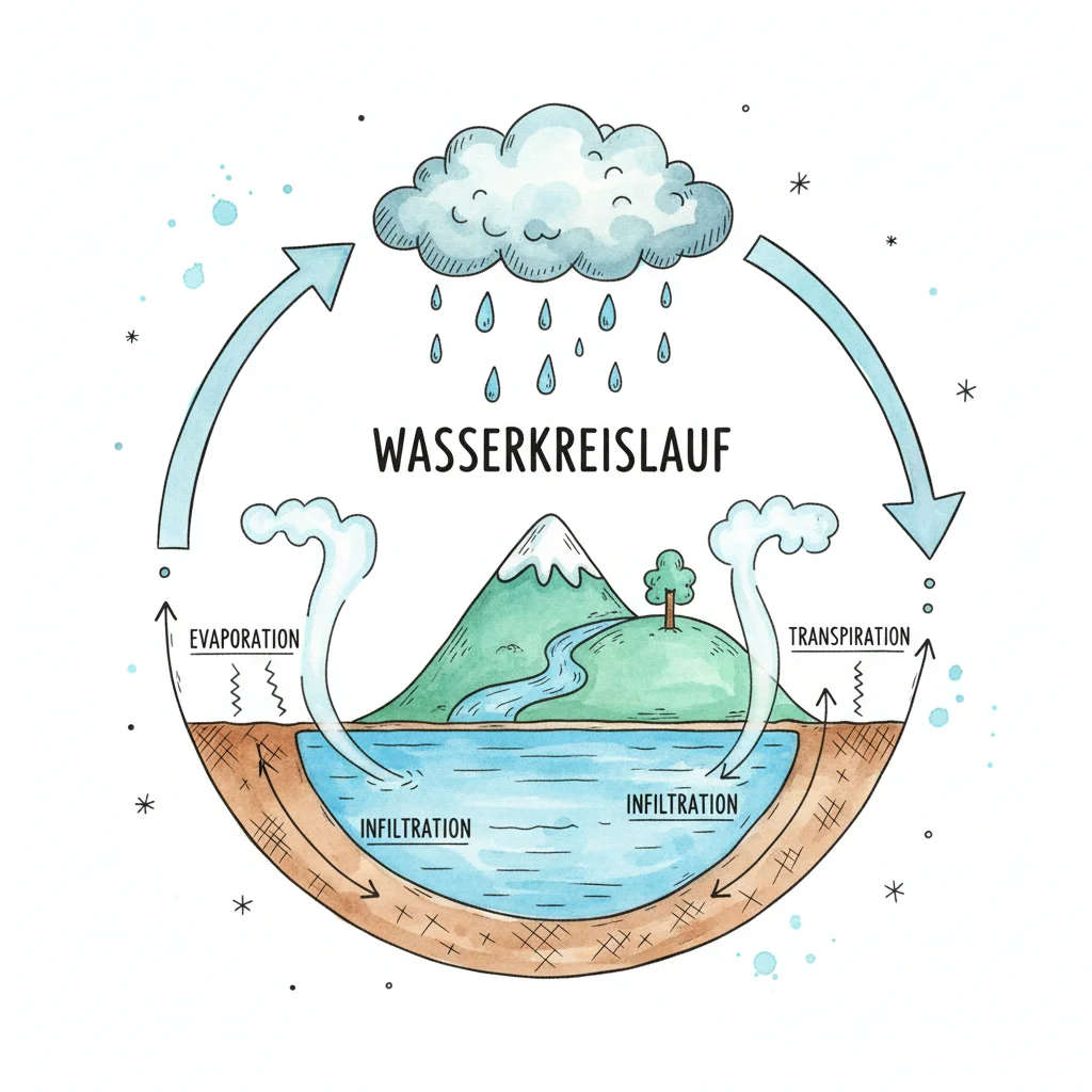 Illustrierte Darstellung des Wasserkreislaufs mit Regen, Verdunstung, Transpiration und Infiltration.