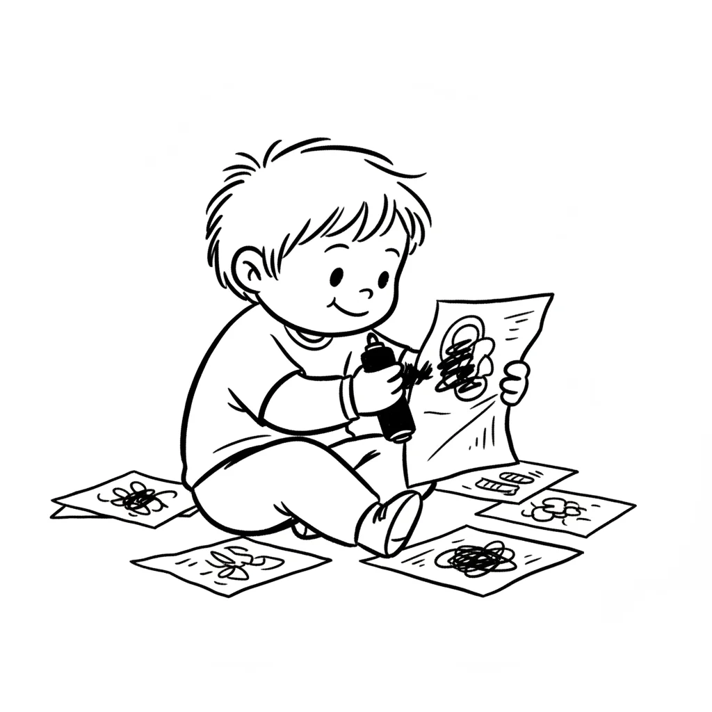 Ein Junge malt fröhlich mit einem Filzstift auf Papier.
