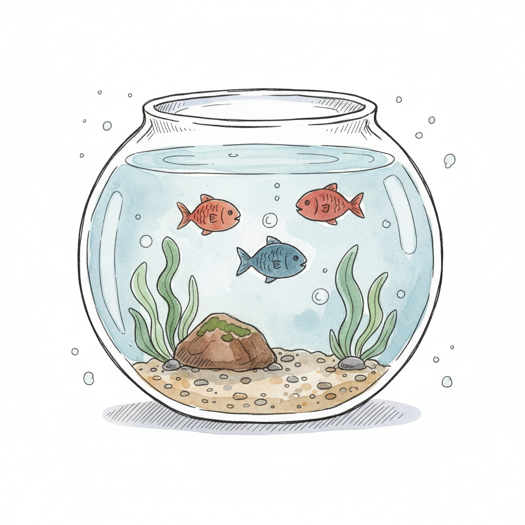 Ein Aquarellbild eines Goldfischglases mit drei Fischen, Pflanzen und einem Stein.