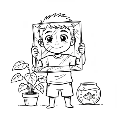 Ein lächelnder Junge hält einen leeren Rahmen vor sein Gesicht, neben Topfpflanze und Goldfischglas.
