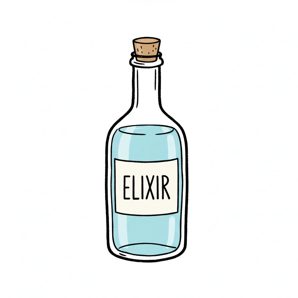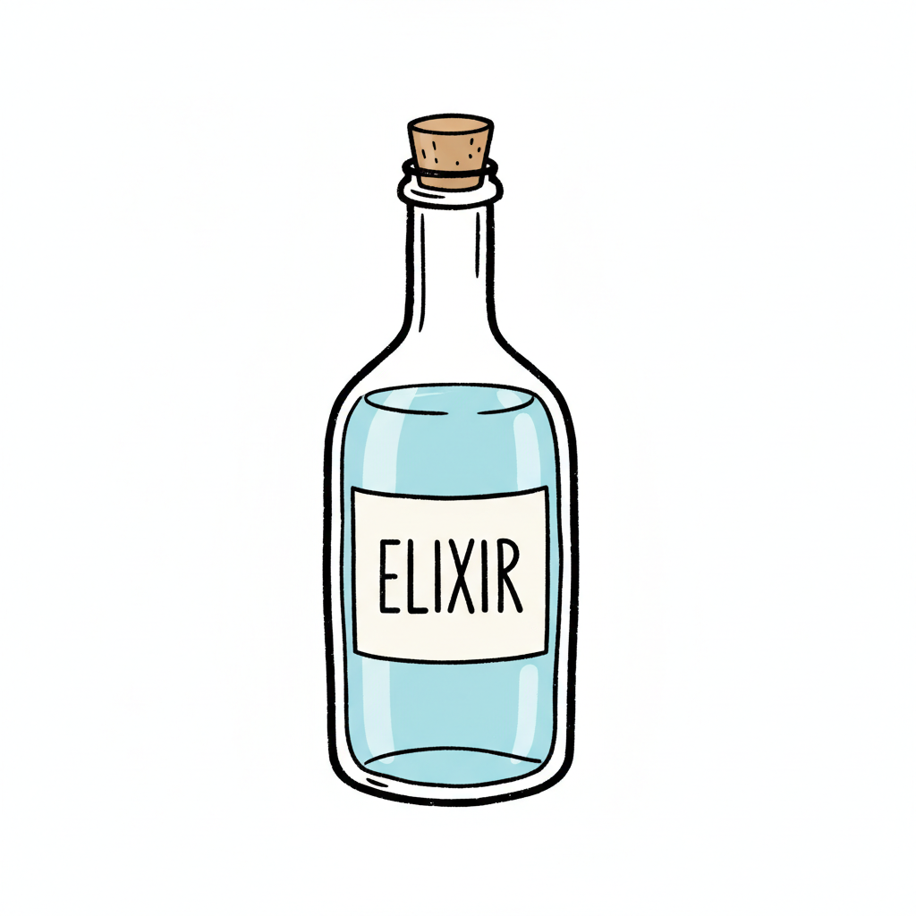 Ein Fläschchen mit der Aufschrift 'ELIXIR' und blauem Inhalt.