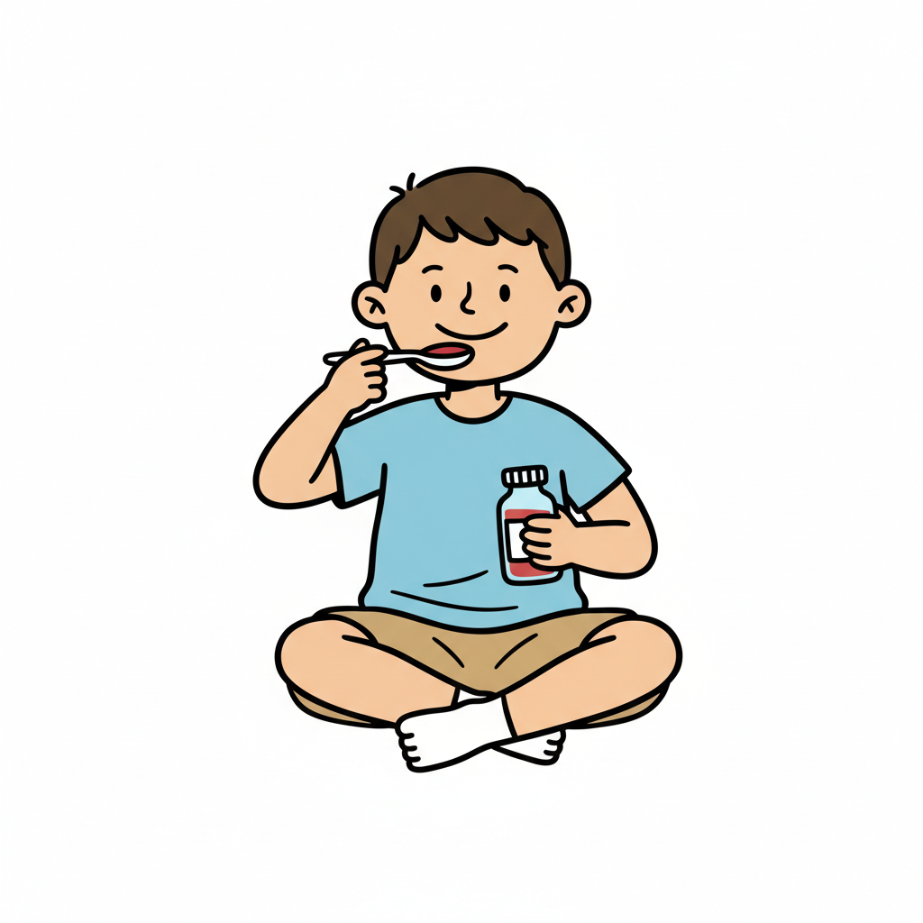 Ein Junge sitzt und nimmt einen Löffel Medizin aus einem Fläschchen.