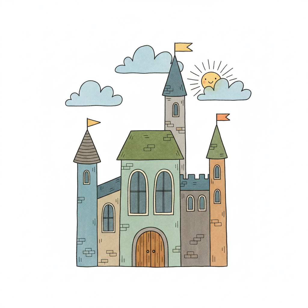 Buntes Märchenschloss mit Türmen, Flaggen und Sonne im Hintergrund.