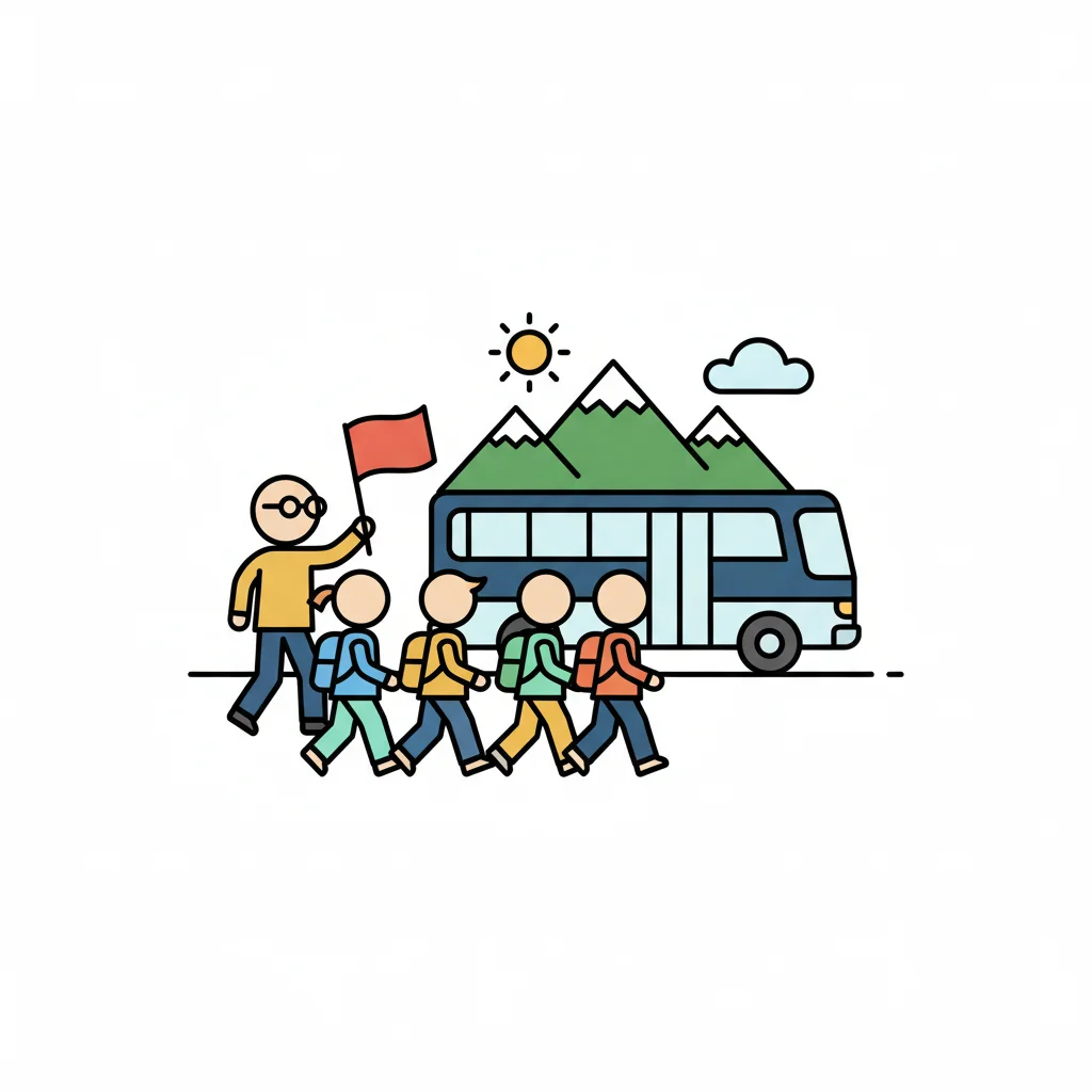 Eine Gruppe von Kindern geht zum Bus, angeführt von einer Person mit einer Flagge.