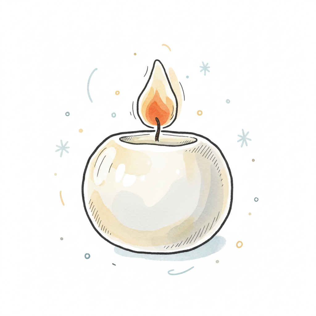 Eine stilisierte Kerze mit flammendem Docht leuchtet sanft.