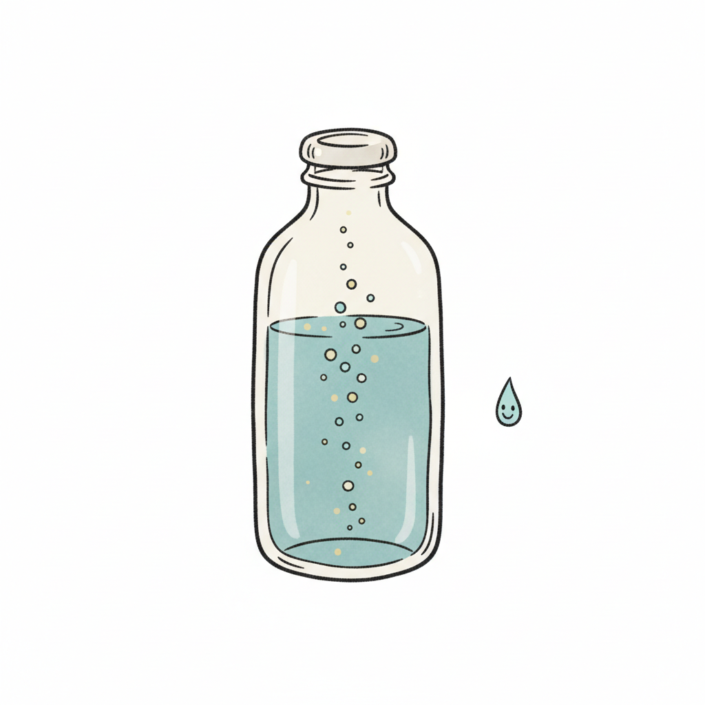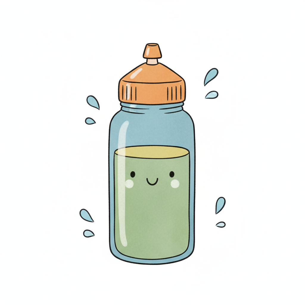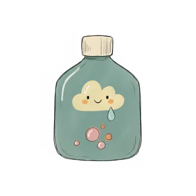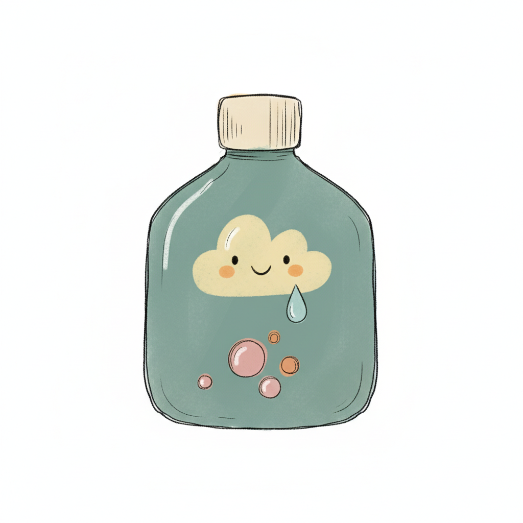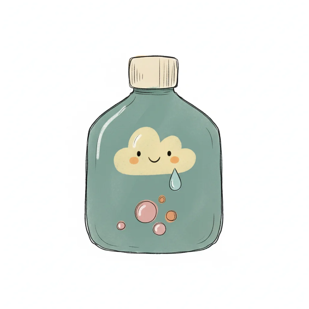 Flasche mit lächelnder Wolke und Blasen, kindlich und freundlich gestaltet.