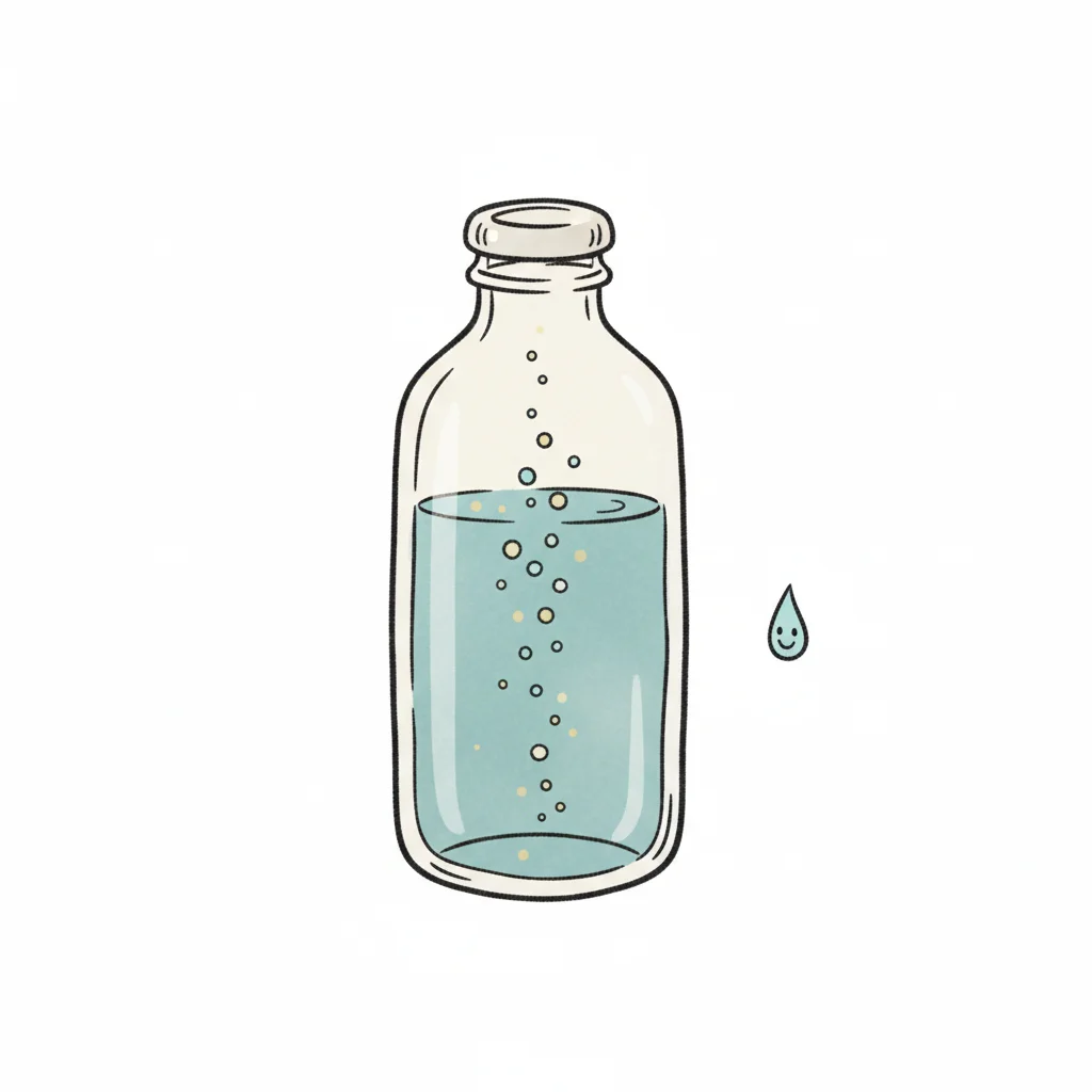 Eine Flasche mit Wasser und sprudelnden Blasen, daneben ein kleiner Wassertropfen.