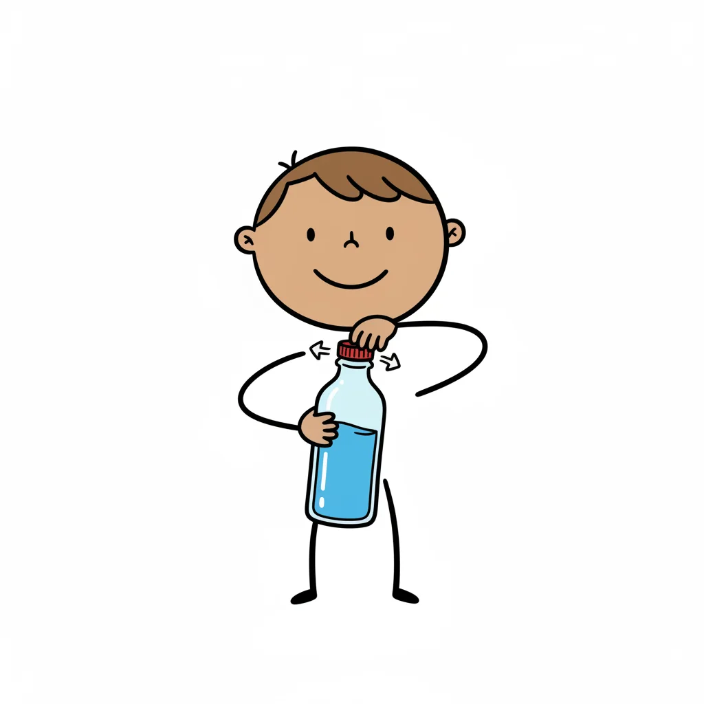 Ein fröhlicher Junge öffnet eine Wasserflasche.