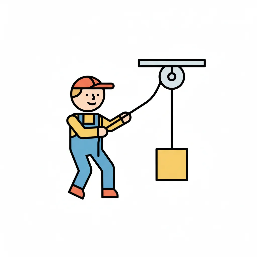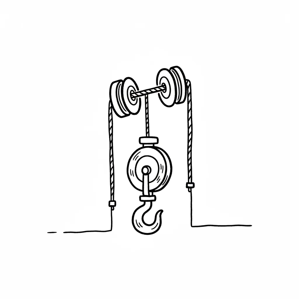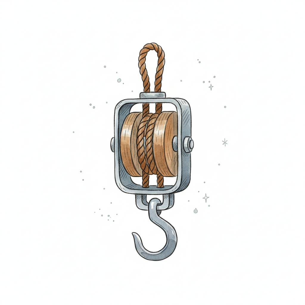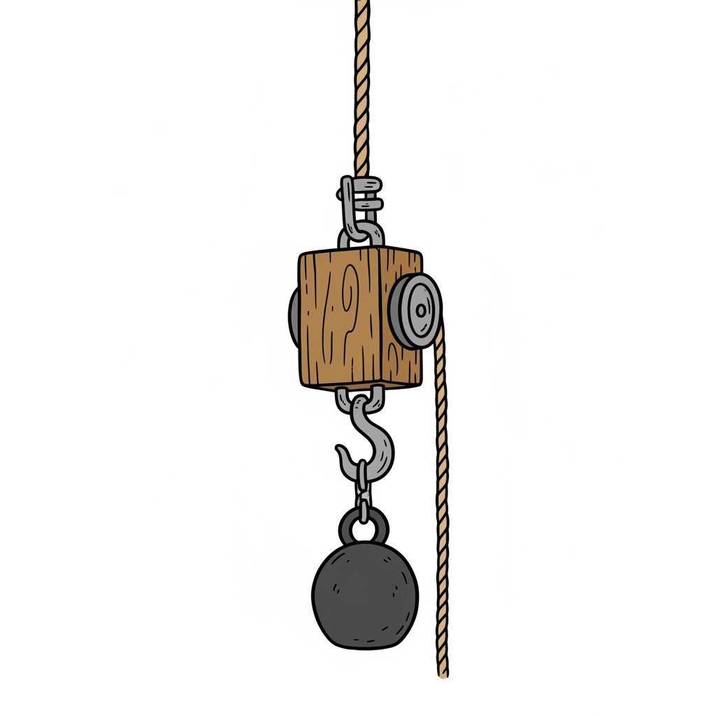 Cartoonzeichnung eines Flaschenzugs mit Holzblock, Seil, Haken und einem schweren Gewicht.