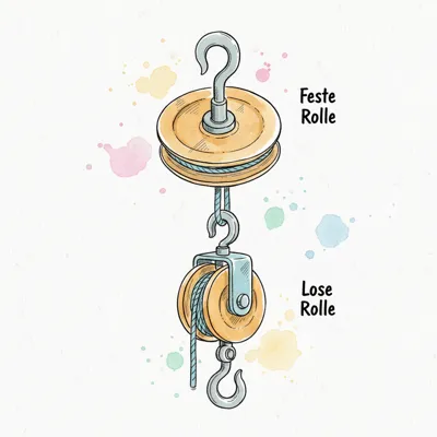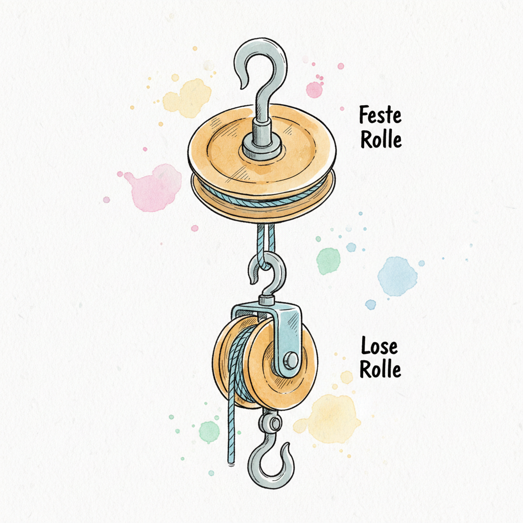 Illustration einer festen und einer losen Rolle mit Seil und Haken, Beschriftung auf Deutsch.