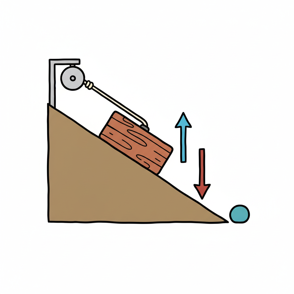 Physik-Diagramm: Holzklotz auf schiefer Ebene, mit Flaschenzug und Kraftpfeilen.